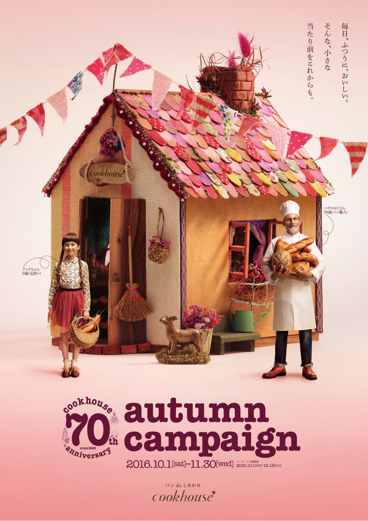大阪府を中心に展開するベーカリー「cookhouse」。創業70周年を機に、何か販促活動ができないかと当社にご相談がありました。いくつかの方向性ご提案させて頂き、最終的にcookhouseをイメージしたオリジナルキャラクターを軸に展開することに。パン屋さんのおじいさんと可愛い看板孫娘が繰り広げる「ホッ」とするようなキャラクター設計で、店内ポスター等プロモーション・広告展開を担当致しました。クライアントからもご好評頂き、70周年以降も「WEB絵本」「オリジナルパン募集」等 毎年様々な企画を提案・展開させて頂きました。