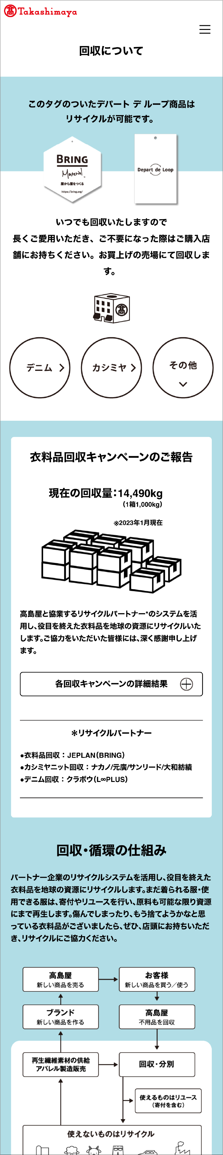サステナブルな循環型社会の実現を目指した高島屋のプロジェクト「Depart de Loop(デパート デ ループ)」。ファッションを楽しむと同時に、環境負荷を減らして限りある資源を守る活動を、シンプルなデザインと写真の構成、バイヤー発信ブログの設置、ミニマムに図式化した説明により、複雑な循環型プロジェクトをより分かりやすく広く伝えています。回収における総力も着実に増え少しづつ活動が定着しています。