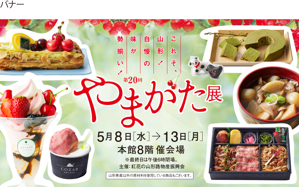 山形県の名産・特産品として、さくらんぼ、米沢牛などを取り揃える、毎年人気の物産催し「やまがた展」。人気のスイーツや初登場のお店、イートイン、ソウルフード、工芸品など、各種トピックのある商品を編集。ファーストビューでは「さくらんぼ」を各媒体でリフレインし、「初夏の爽やかさ」と「やまがた」らしさを表現。デザインはモバイルファーストにシフトし、SNS用リール動画等とあわせ既存顧客以外へのアピール手段として展開、新規顧客の獲得を目指しました。